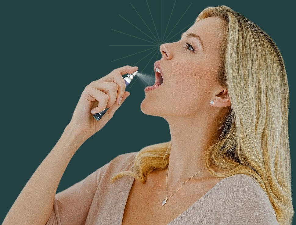 Spray 8 pumps into your inner cheek.